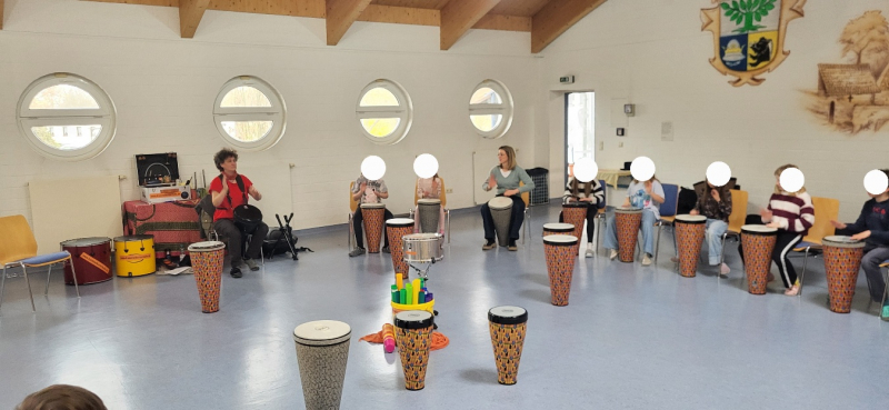 Für dieses Vorhaben haben wir die freiberufliche Percussion-Lehrerin Simone Juppe aus Halle eingeladen. In mehreren Klassen führte sie jeweils eine 60-minütige Unterrichtseinheit durch, in der die Kinder unterschiedliche Übungen mit Trommeln kennenlernen und ausprobieren konnten. Dabei ging es nicht nur um das reine Trommeln, sondern auch um das gemeinsame Hören, das Einhalten von Rhythmen und das Zusammenspiel in der Gruppe.